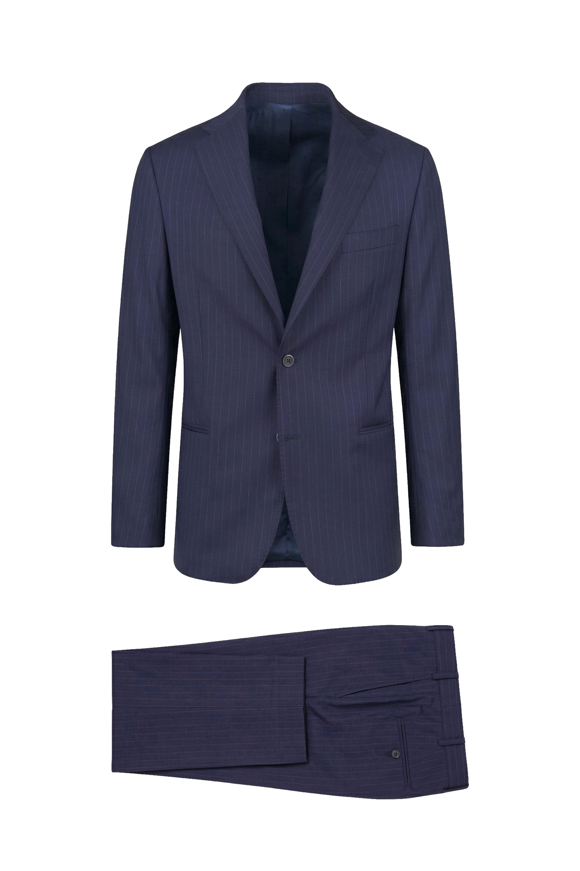 Single-breasted two-button jacket; lined chest construction; partial AMF stitching; welt chest pocket; front welt pockets; trousers with single front pleat; slanted side pockets; rear welt pockets with button closure.