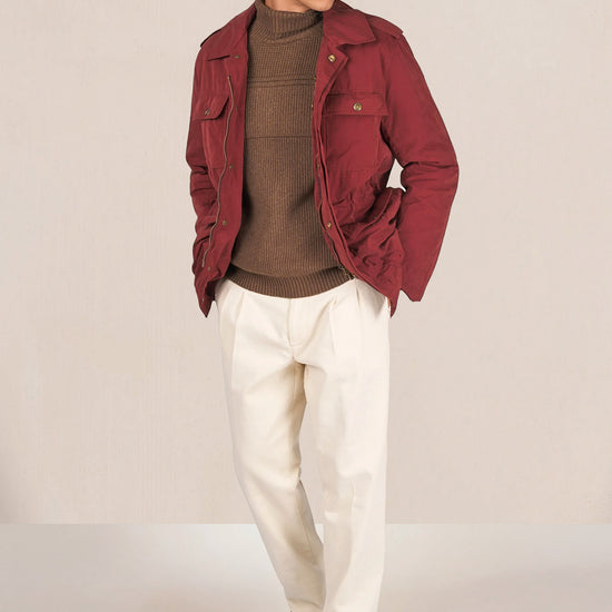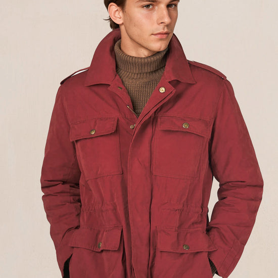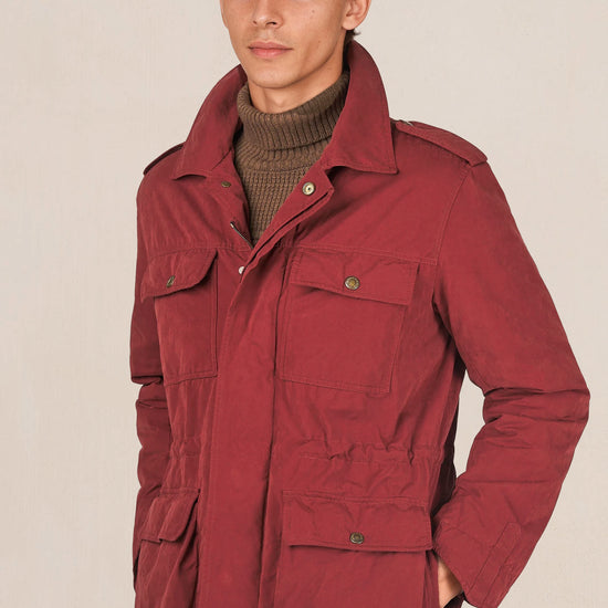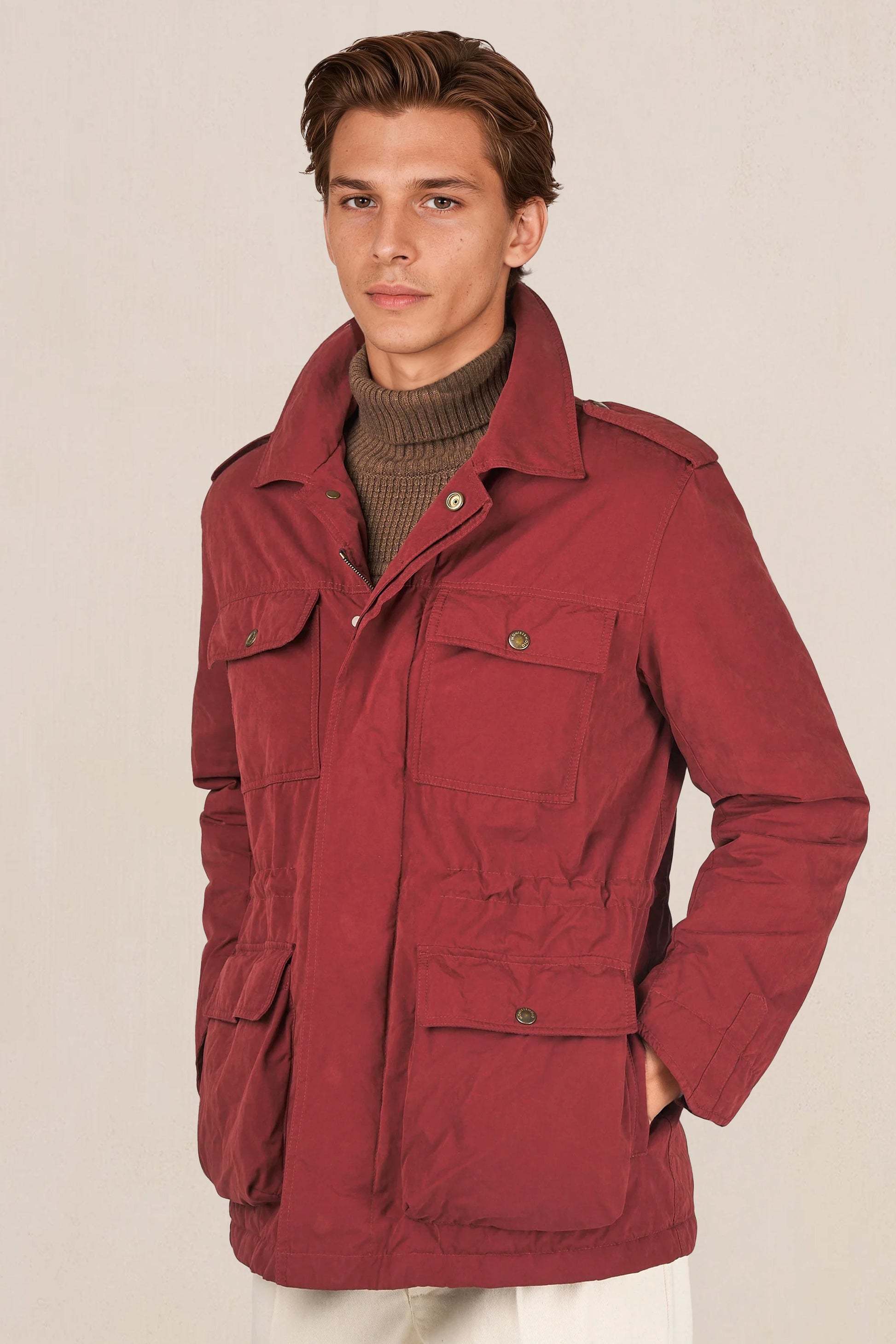 Quilted safari jacket with a contemporary field-inspired look and a regular, mid-length cut. The shell is a matte, dry-hand fabric blend chosen for durability, easy care and everyday comfort. The front closes with a full zipper hidden under a snap-button storm flap, while the shirt collar and shoulder epaulettes reinforce the army DNA. The front layout features four generous patch pockets with flaps and snap closures—two on the chest for essentials and two lower pockets for larger items or to warm your hands. Inside, a diamond-quilted lining with light padding traps warmth without bulk; an elasticated waist channel improves fit and comfort, subtly defining the silhouette. Neat cuff finishes, a slightly rounded hem and visible top-stitching complete the utilitarian character. The result is a practical, comfortable field jacket that moves perfectly from mid-season layering to colder urban days.