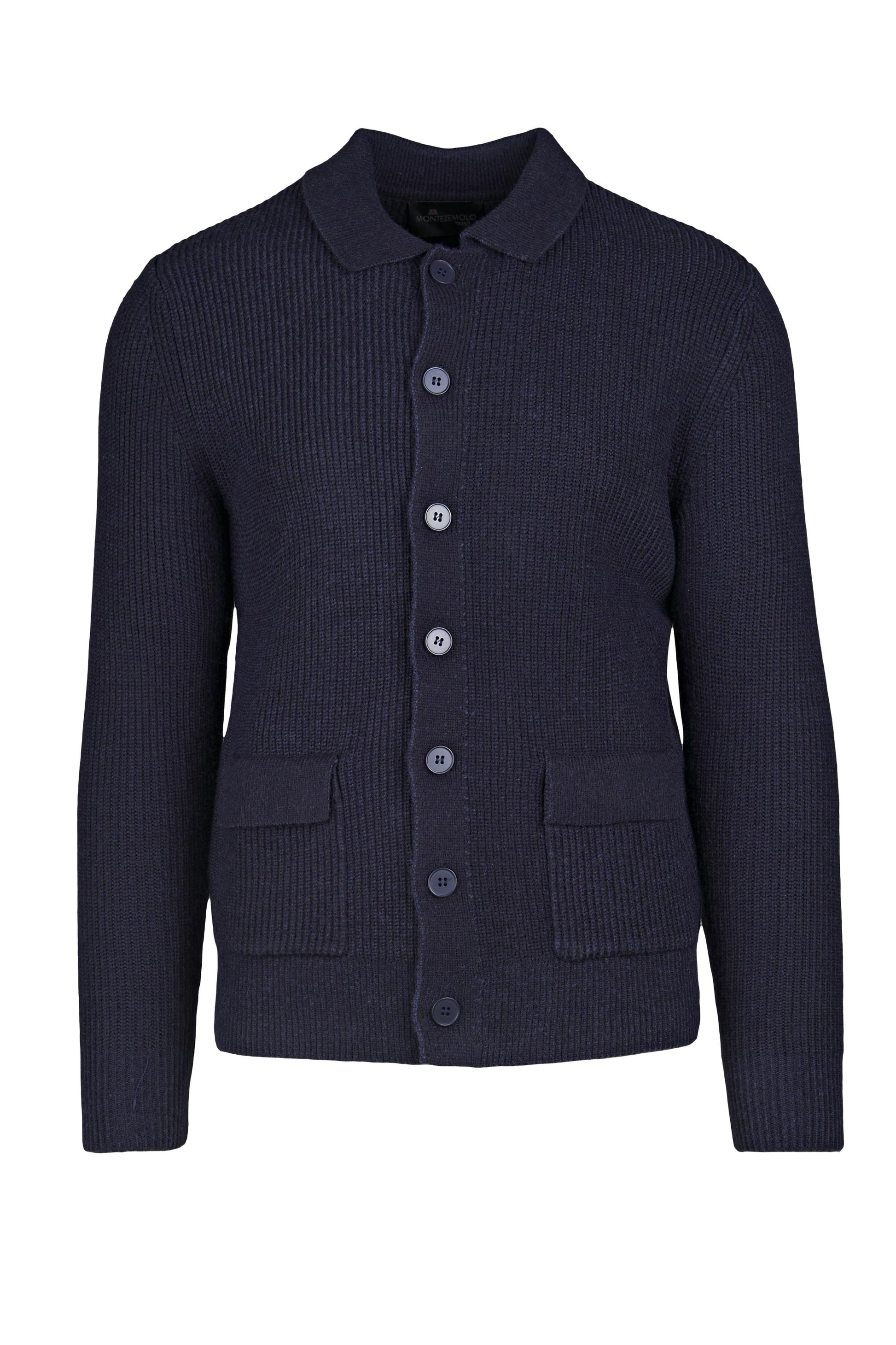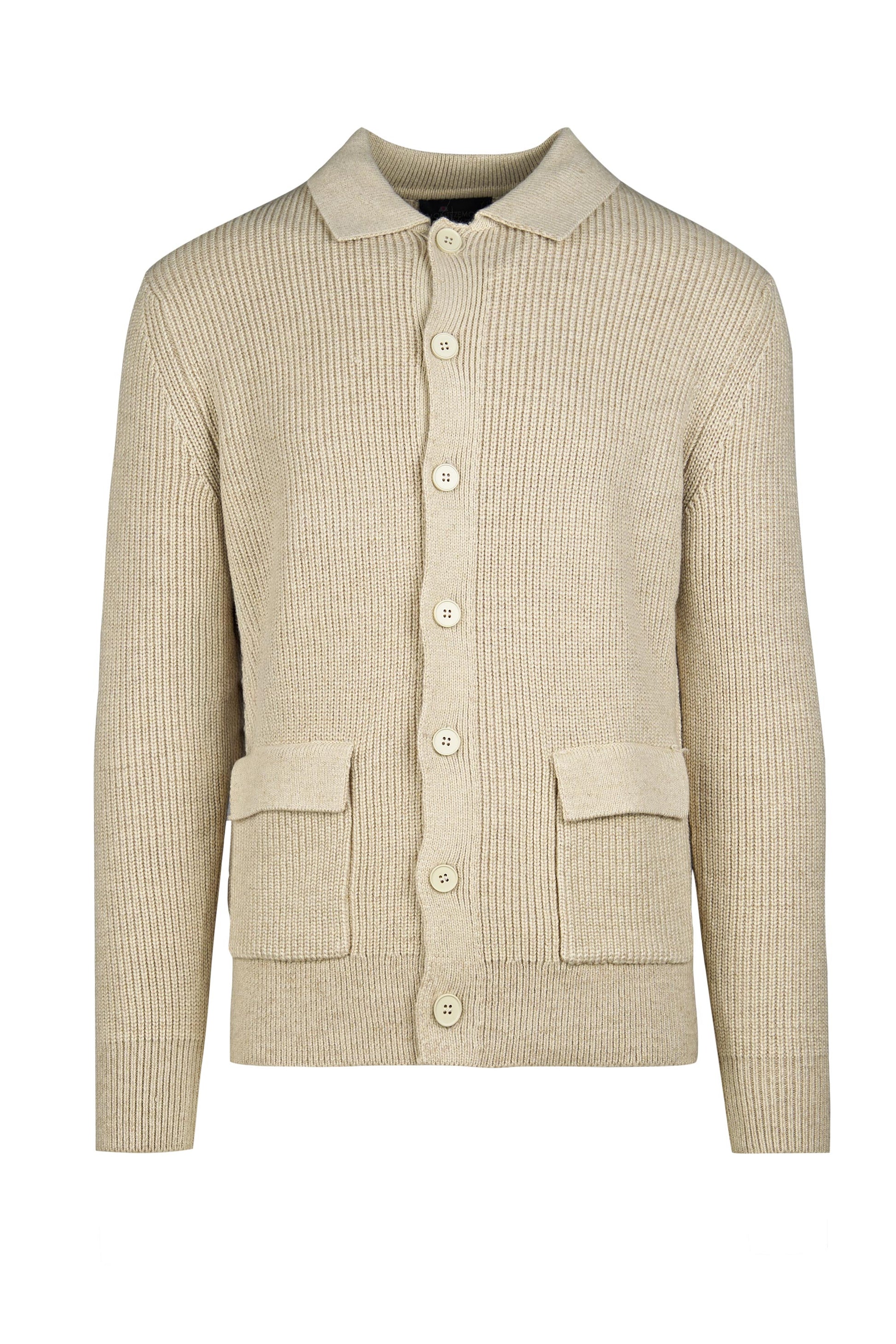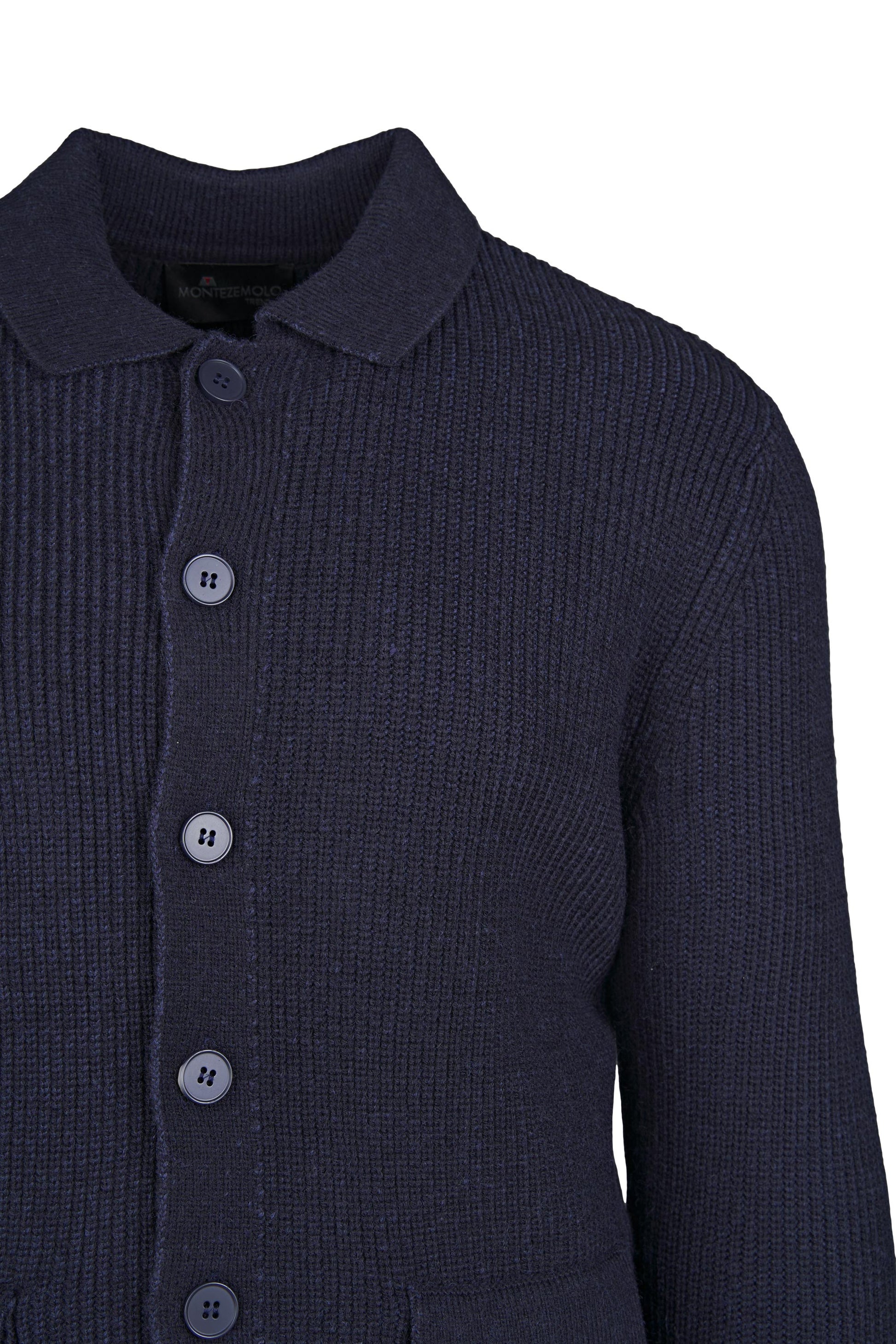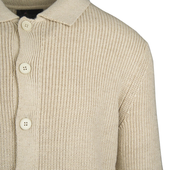 Chunky rib knit; structured shirt collar; tone-on-tone button closure; two flap patch pockets; wide rib cuffs and hem; reinforced front placket.