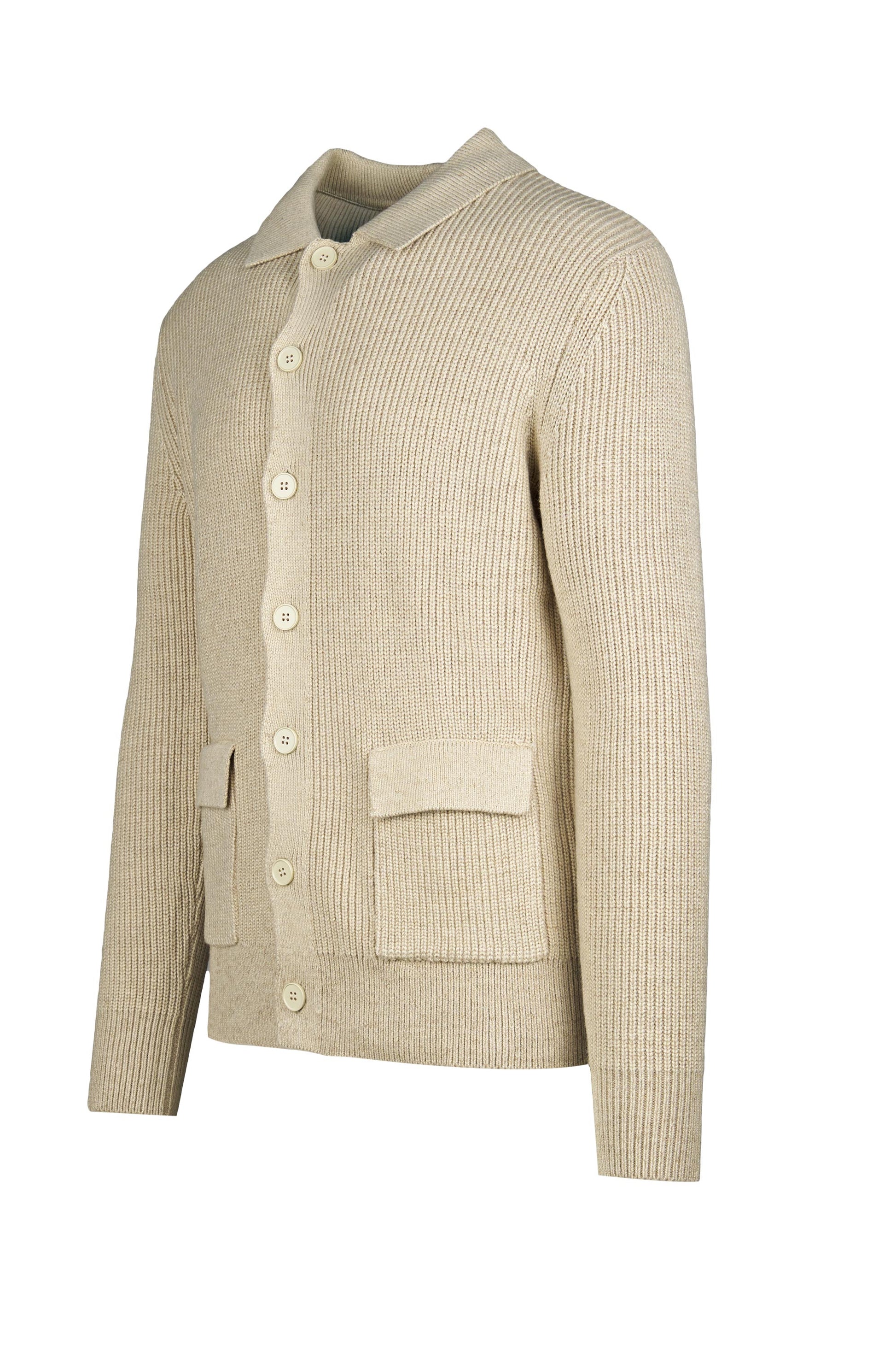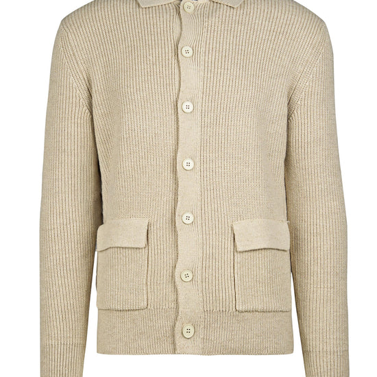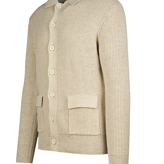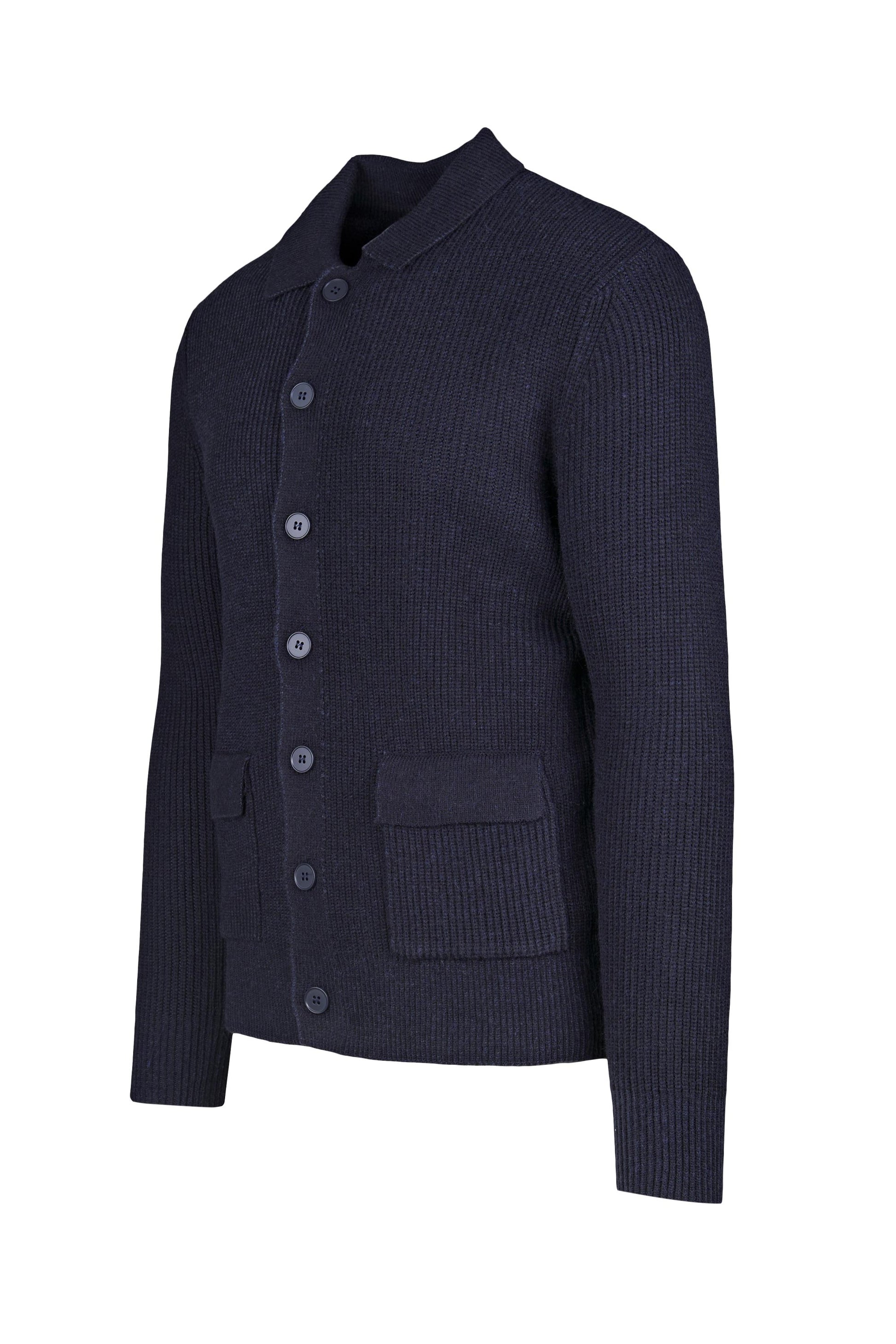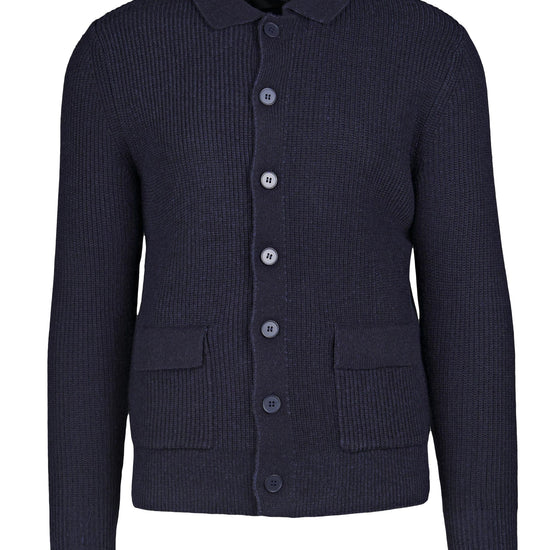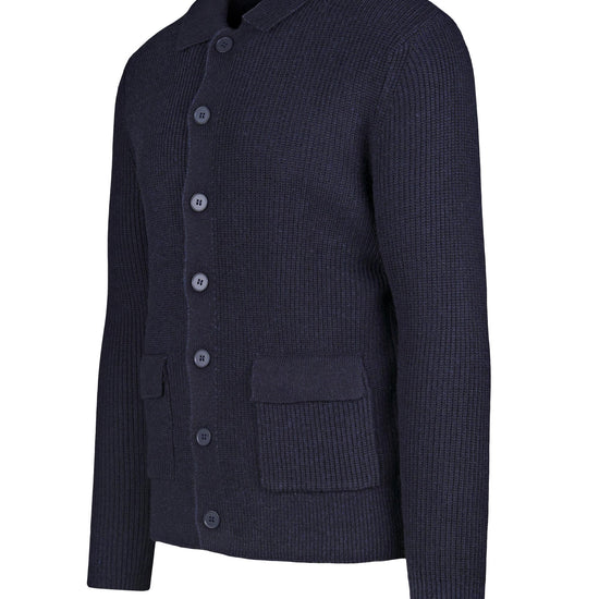 Chunky rib-knit cardigan with a tailored shirt collar and a clean button-through placket. Two flap patch pockets add refined utility, while wide rib cuffs and hem keep the silhouette neat. Regular fit, fully-fashioned construction and a warm, durable blended yarn