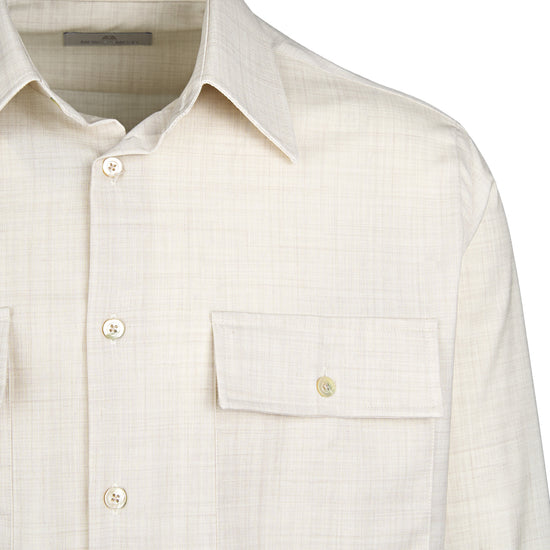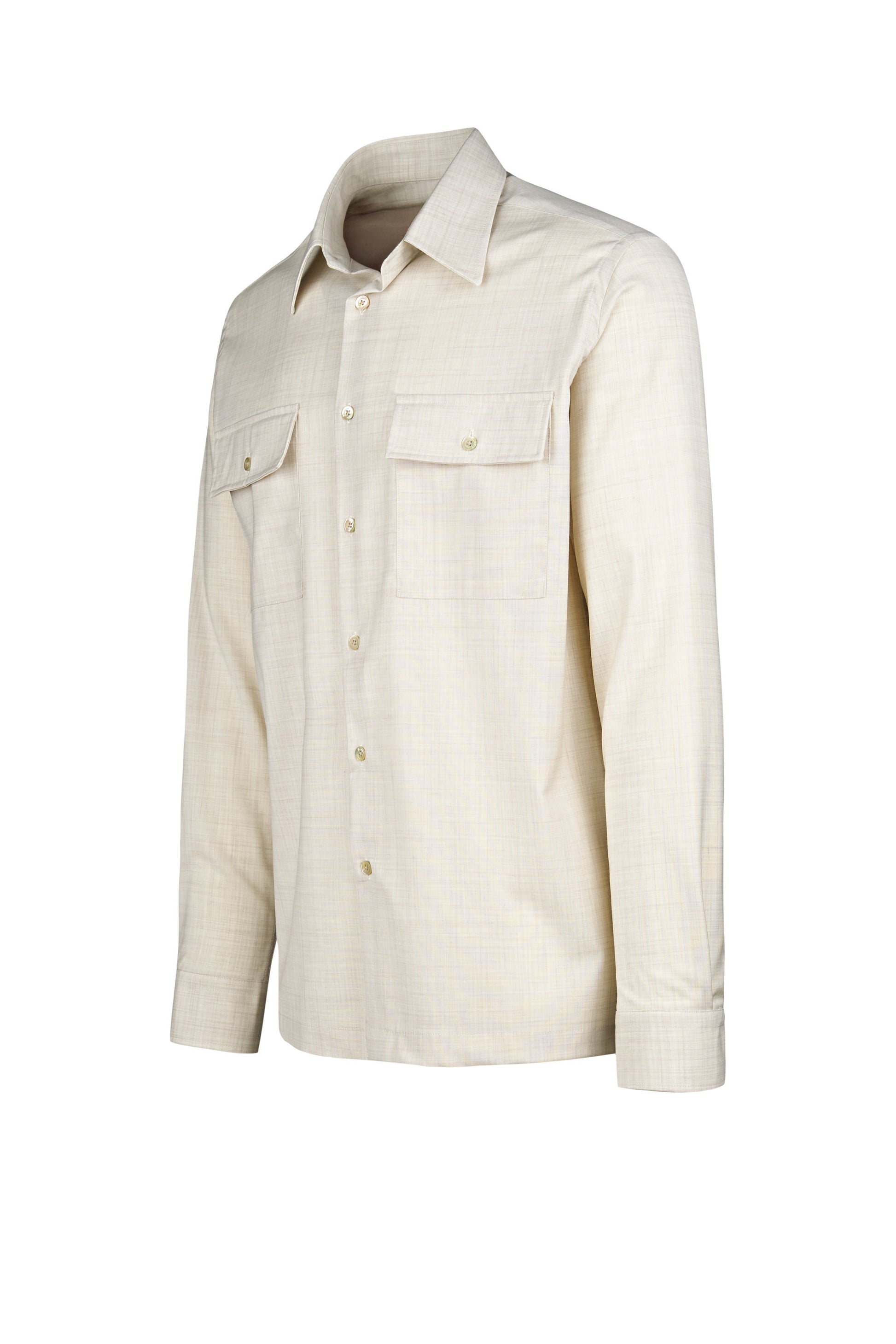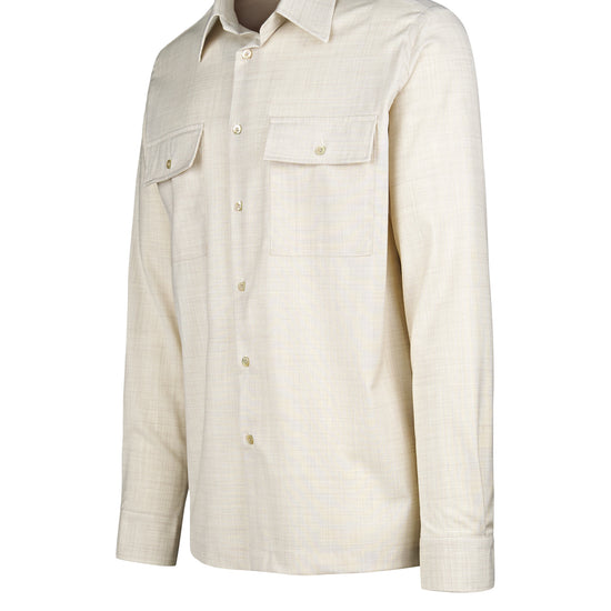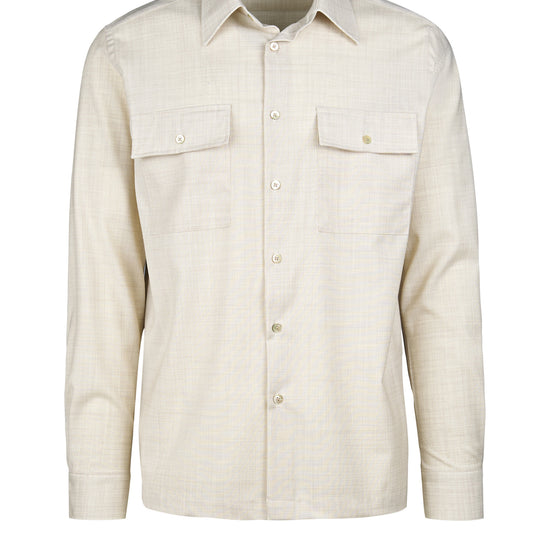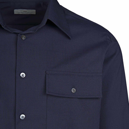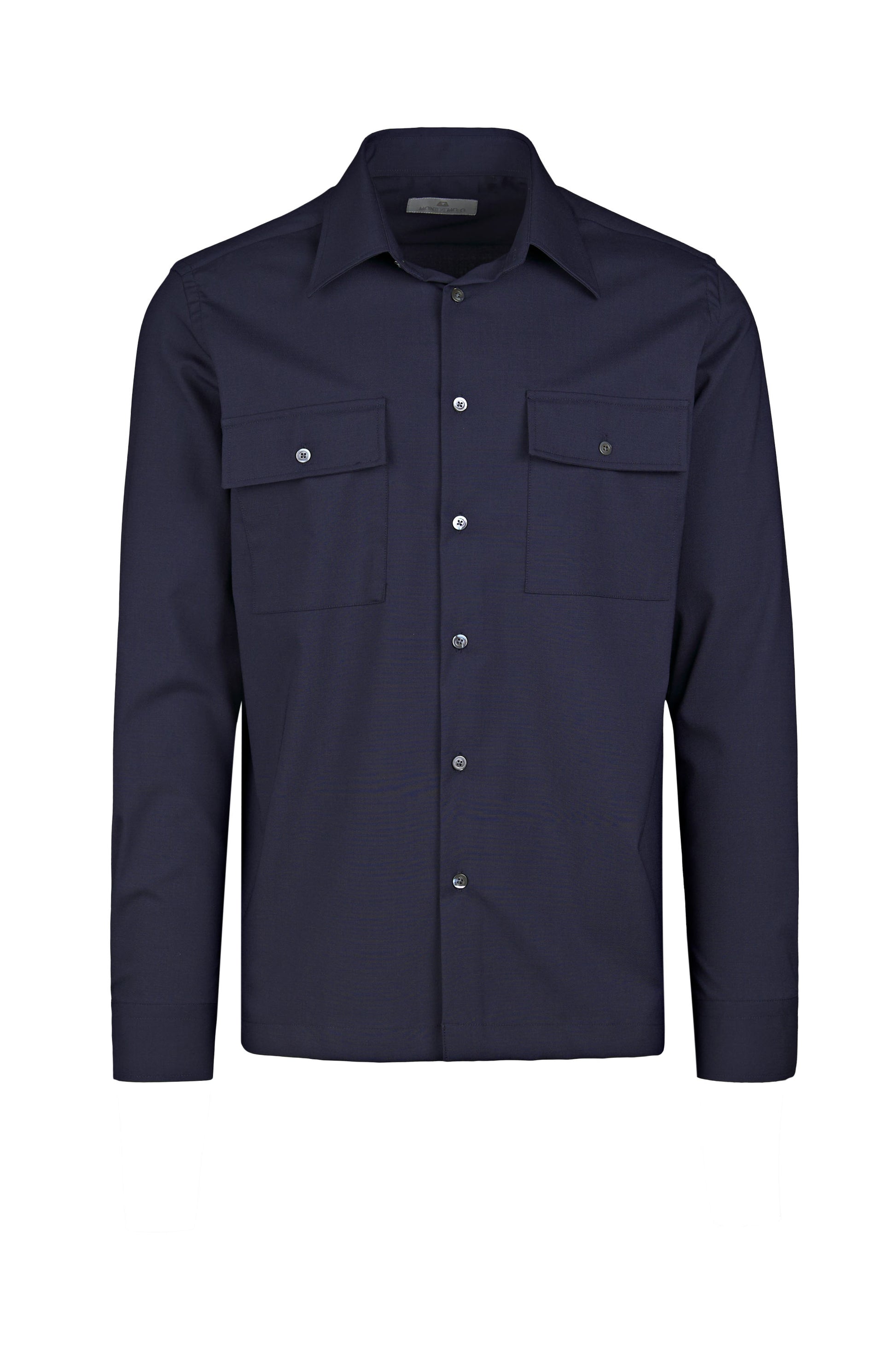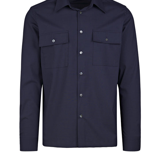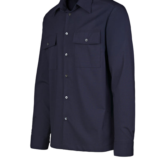 A clean, versatile shirt that also works as a light overshirt. The fabric shows a refined mélange effect created by two-tone yarns; it feels compact and soft with a subtle stretch that moves with you. The signature spear collar with elongated tips adds a sharp, vintage-inspired look and sits perfectly under tailoring. The front features a neat button closure and two applied chest pockets with buttoned flaps. Long sleeves with classic cuffs and a straight hem give a modern silhouette for in- or out-of-trouser wear. Tone-on-tone stitching and sleek buttons complete the minimalist design.