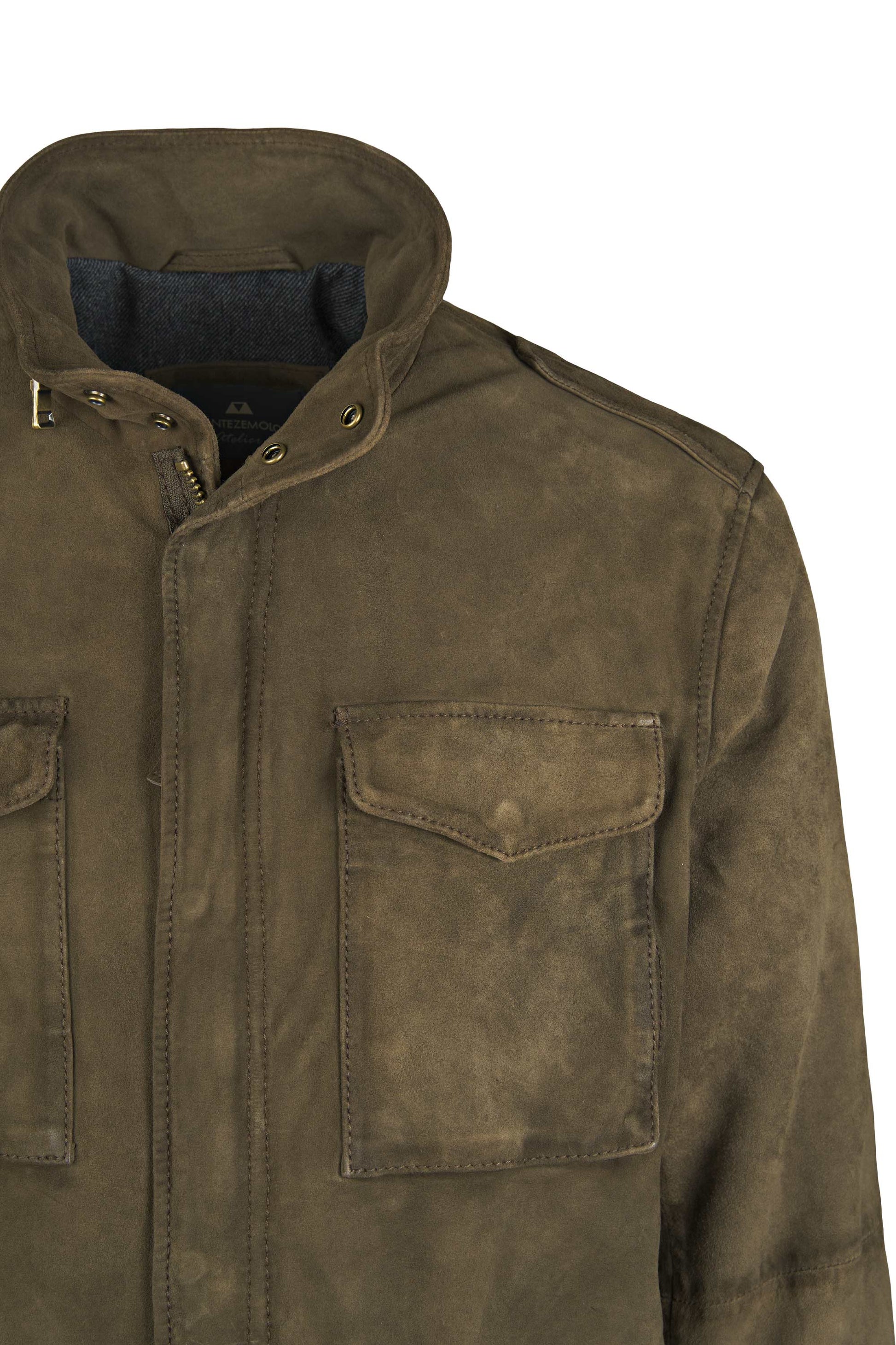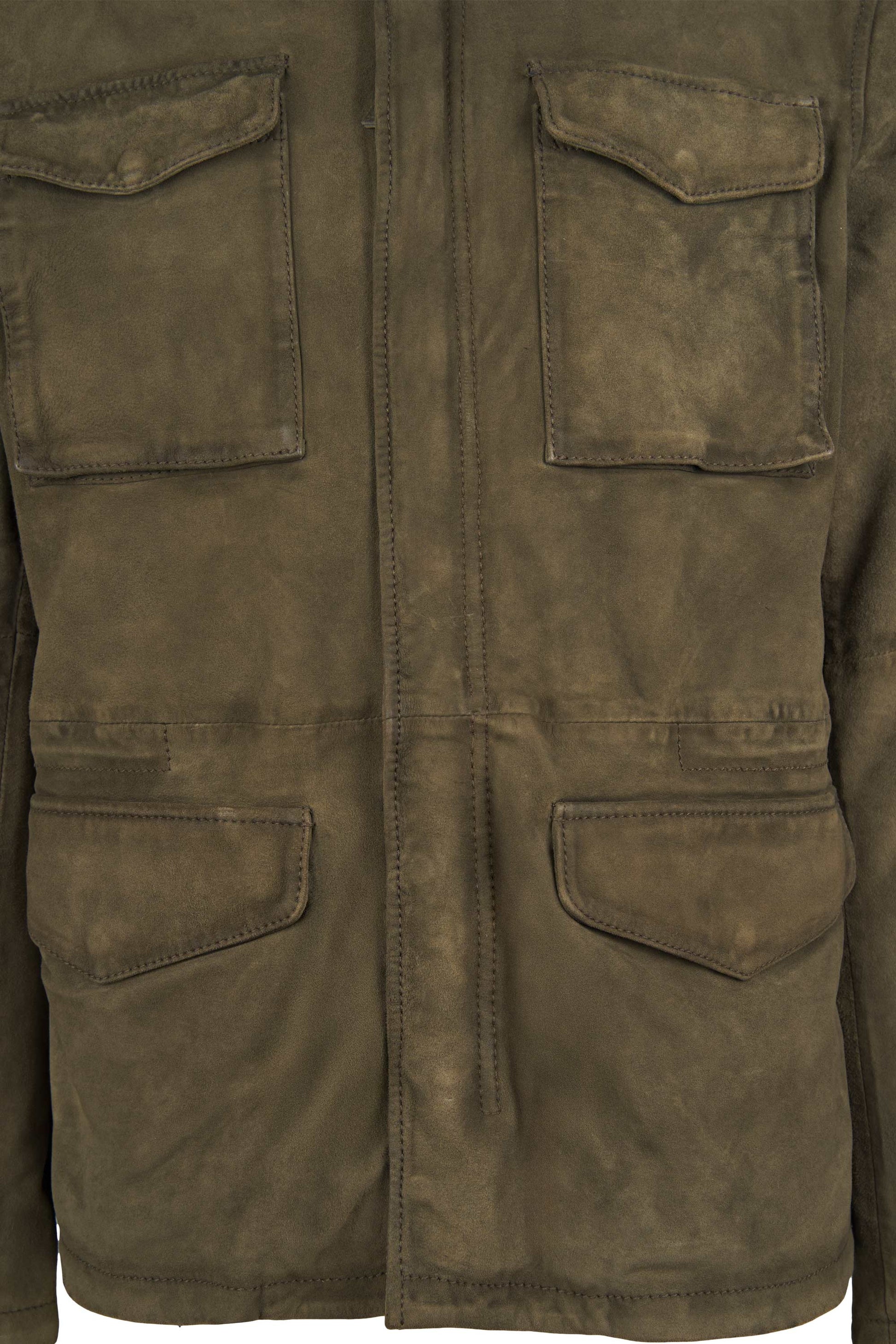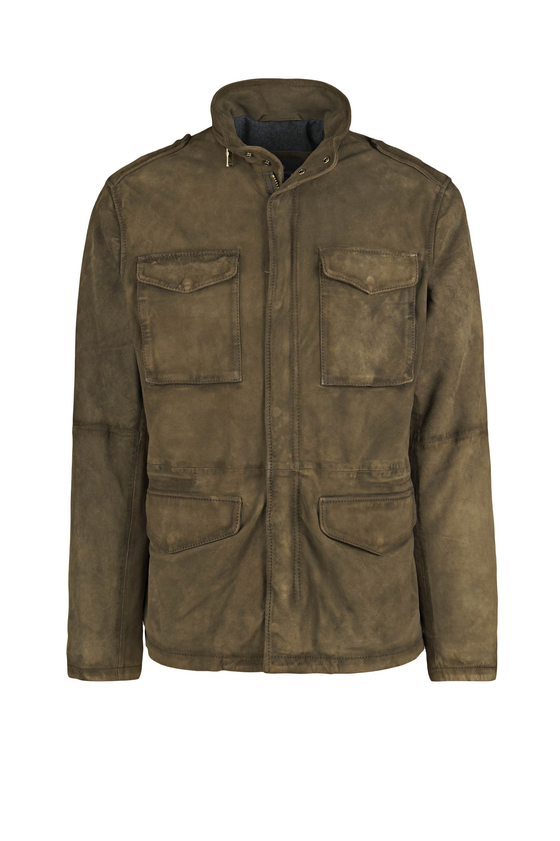 Waxed suede leather, 4 front flap pockets, hidden double-slider zip, shoulder epaulettes, stand-up collar with throat latch, technical inner lining
