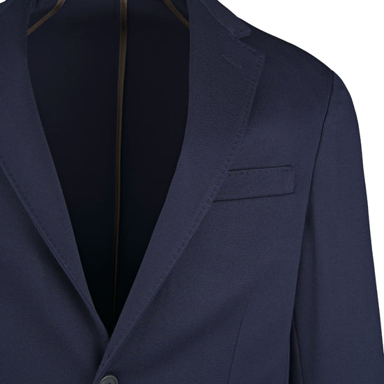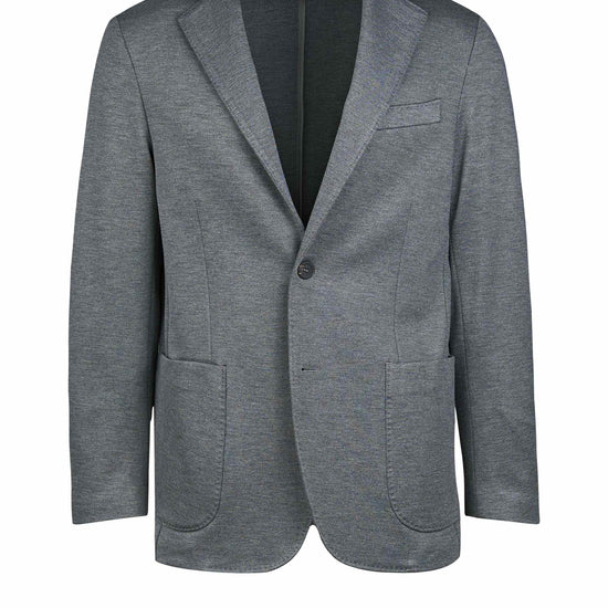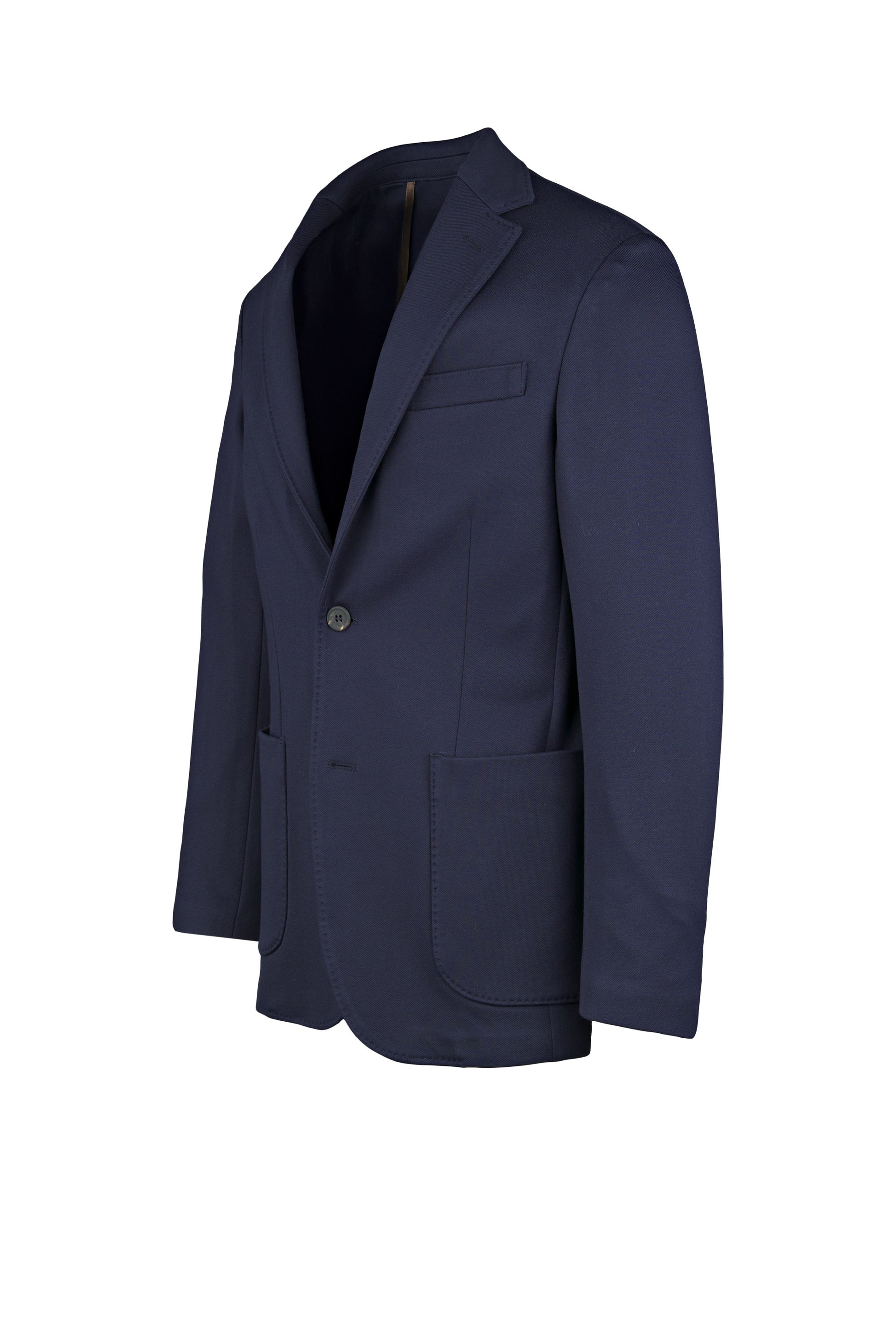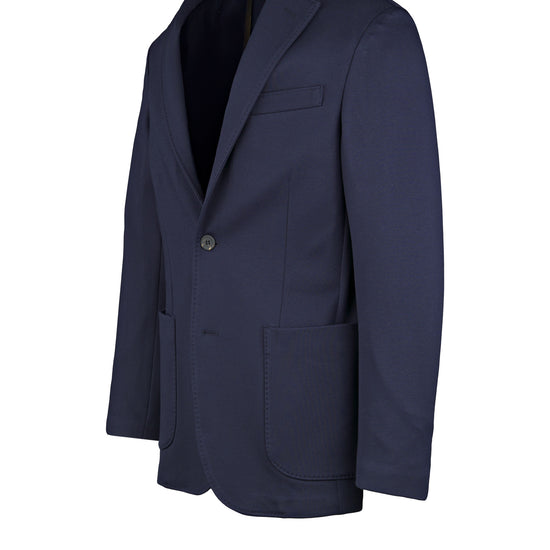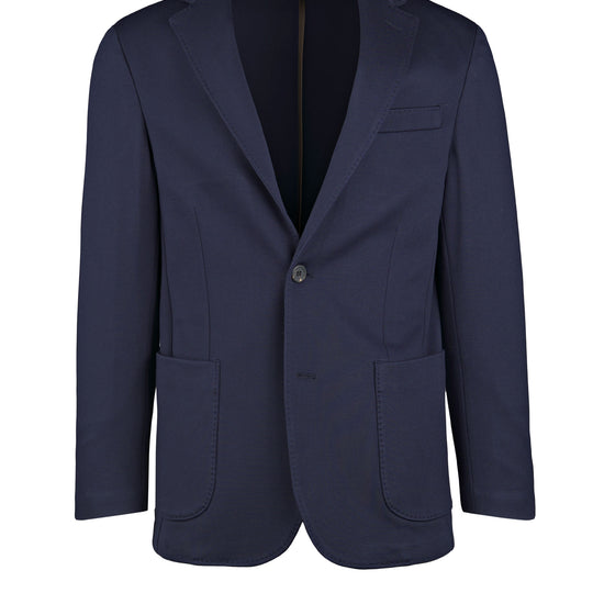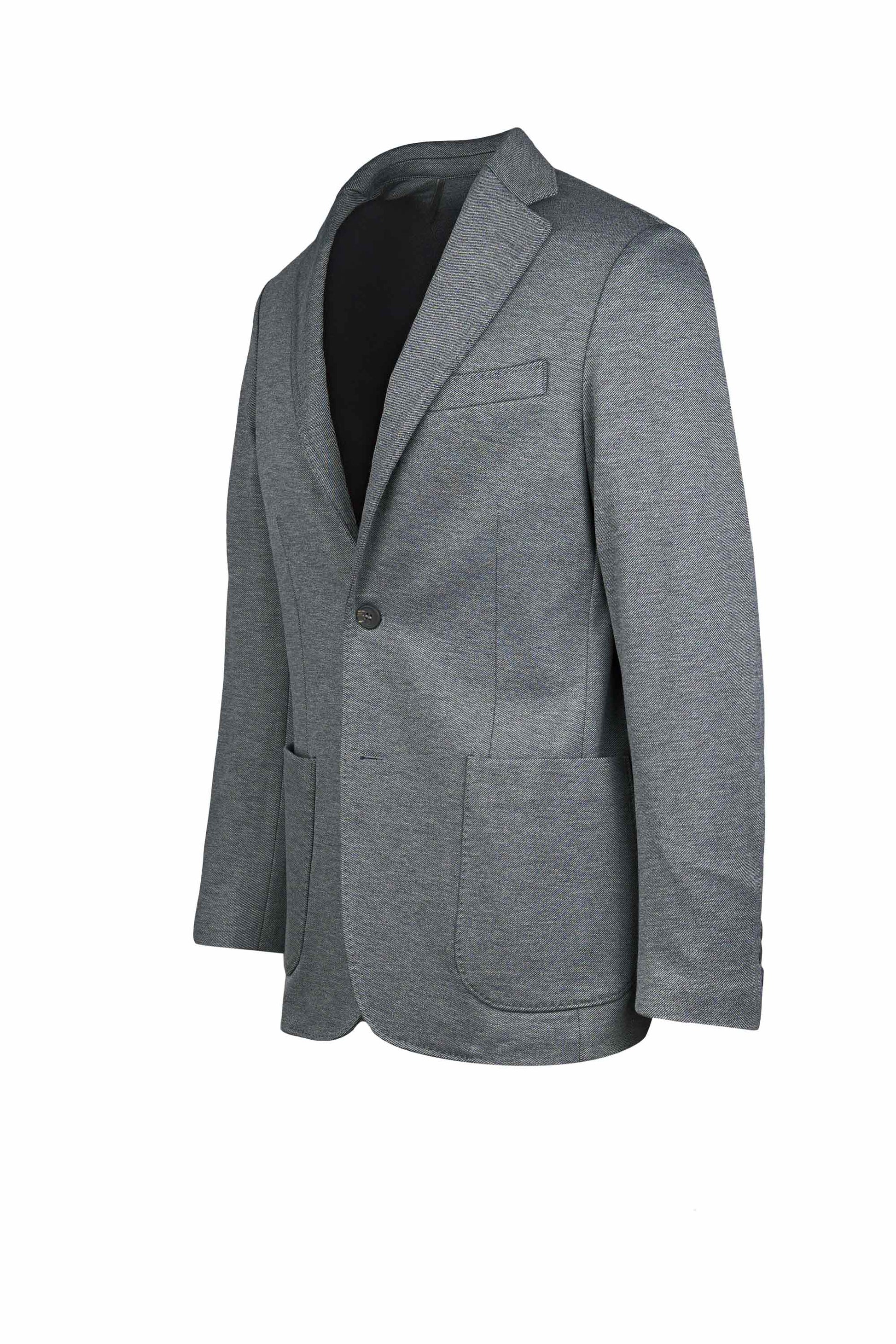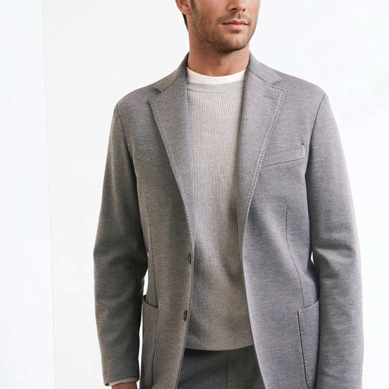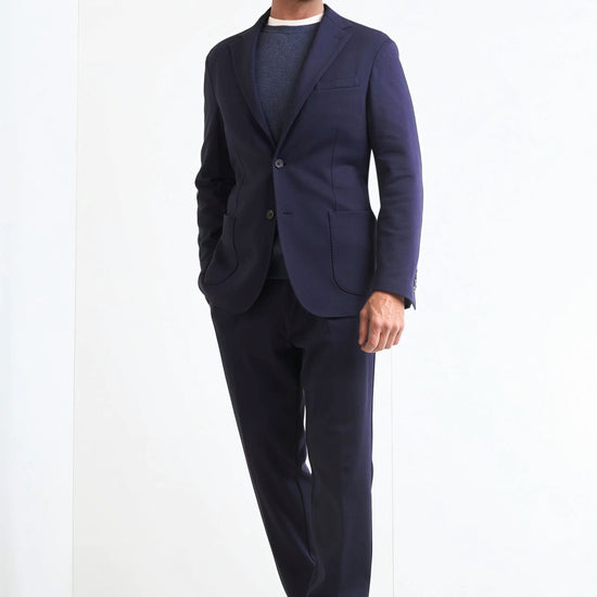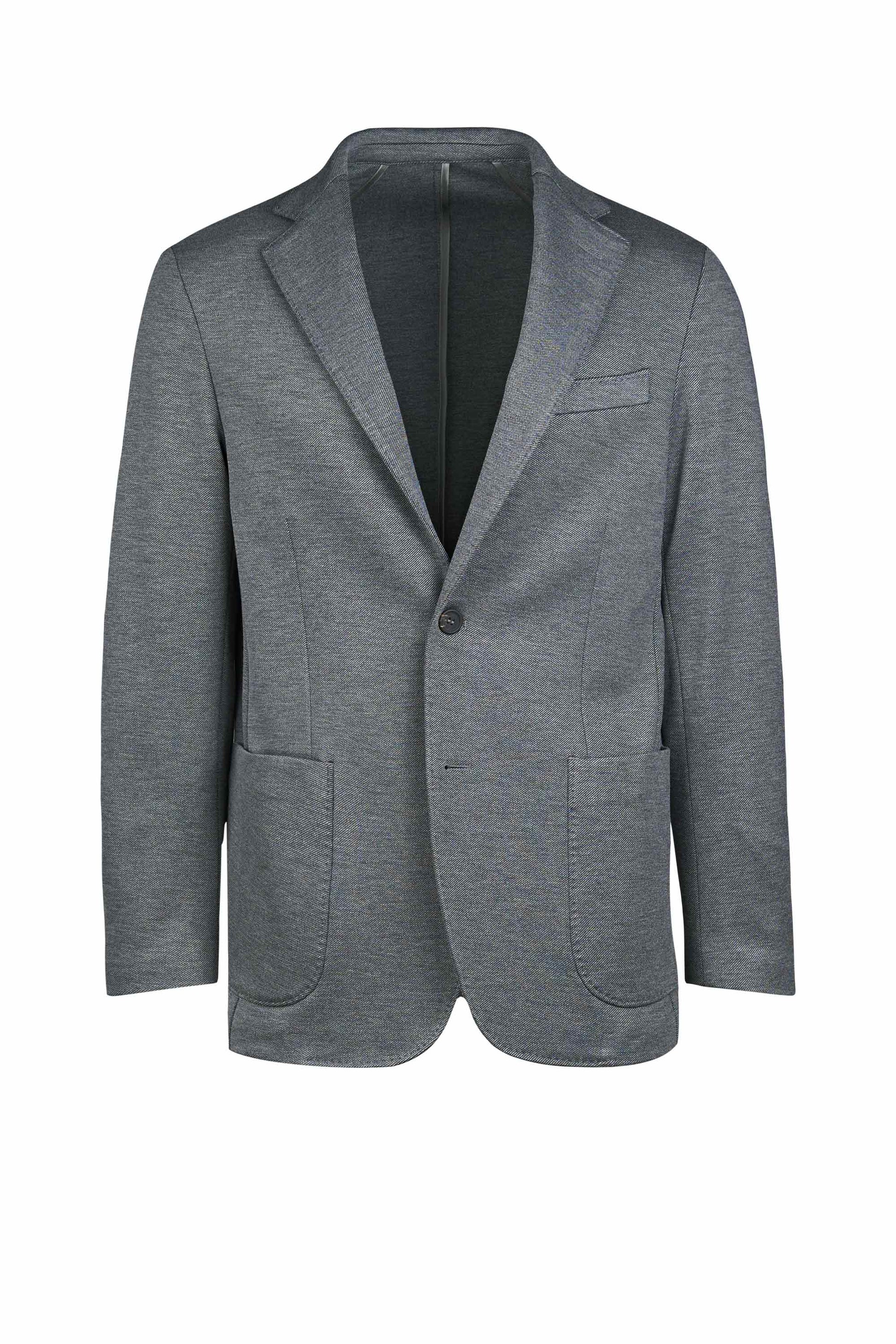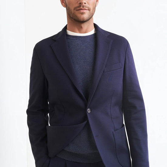 Stretch jersey-twill with a compact yet soft touch; feather-light unlined construction and natural shoulders for ease of movement; AMF stitching along lapels and edges adds a sartorial note; welt chest pocket and twin patch pockets for everyday utility; cotton-tech blend that is crease-resistant and shape-retentive thanks to elastane; clean, taped interiors for durability.