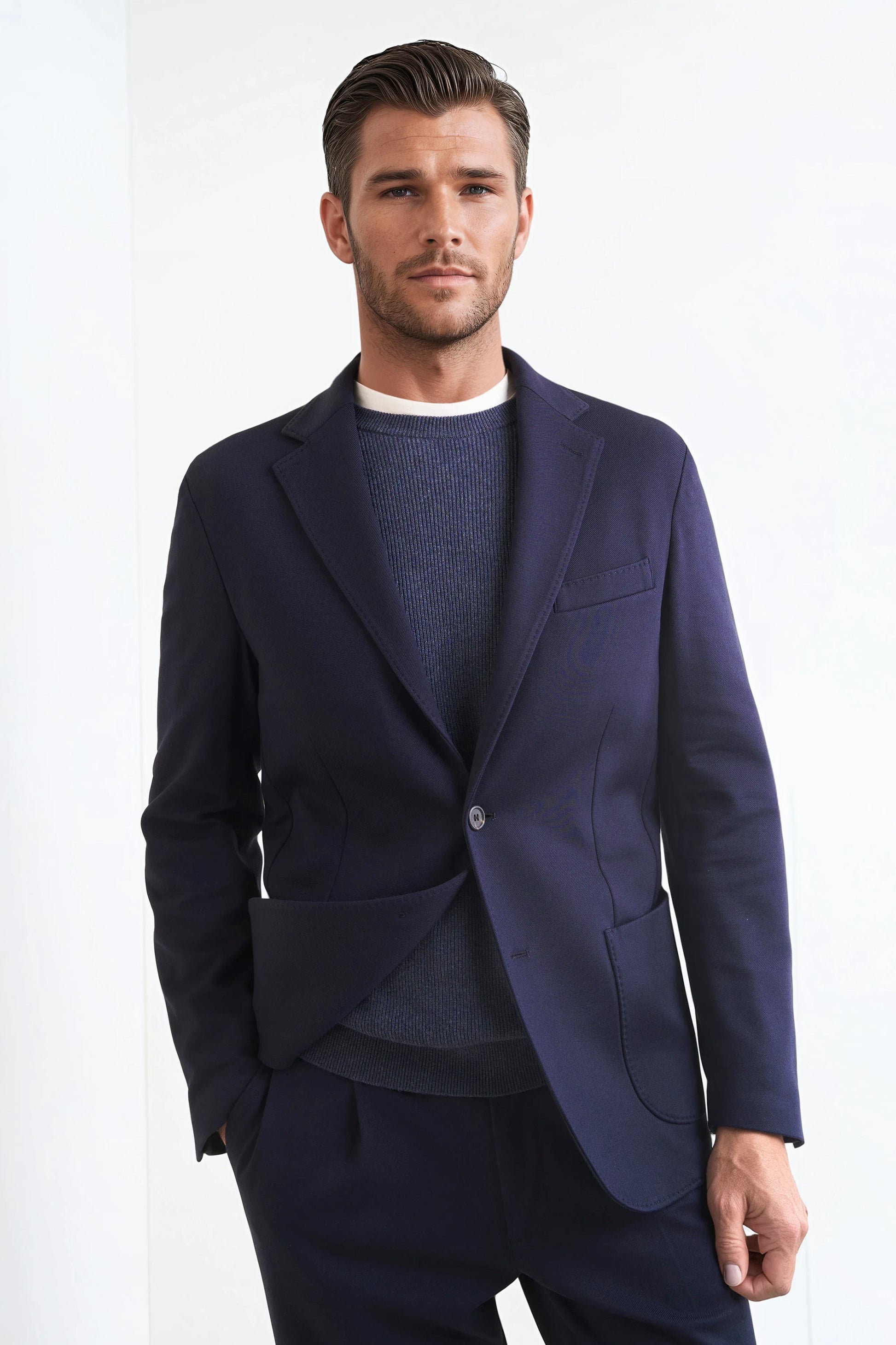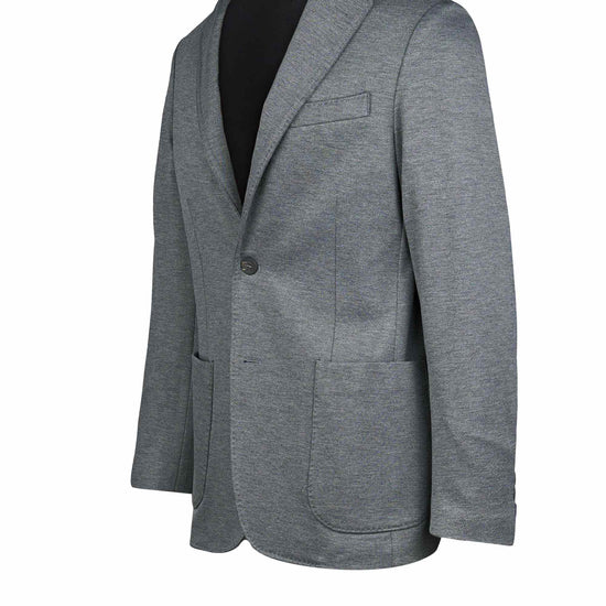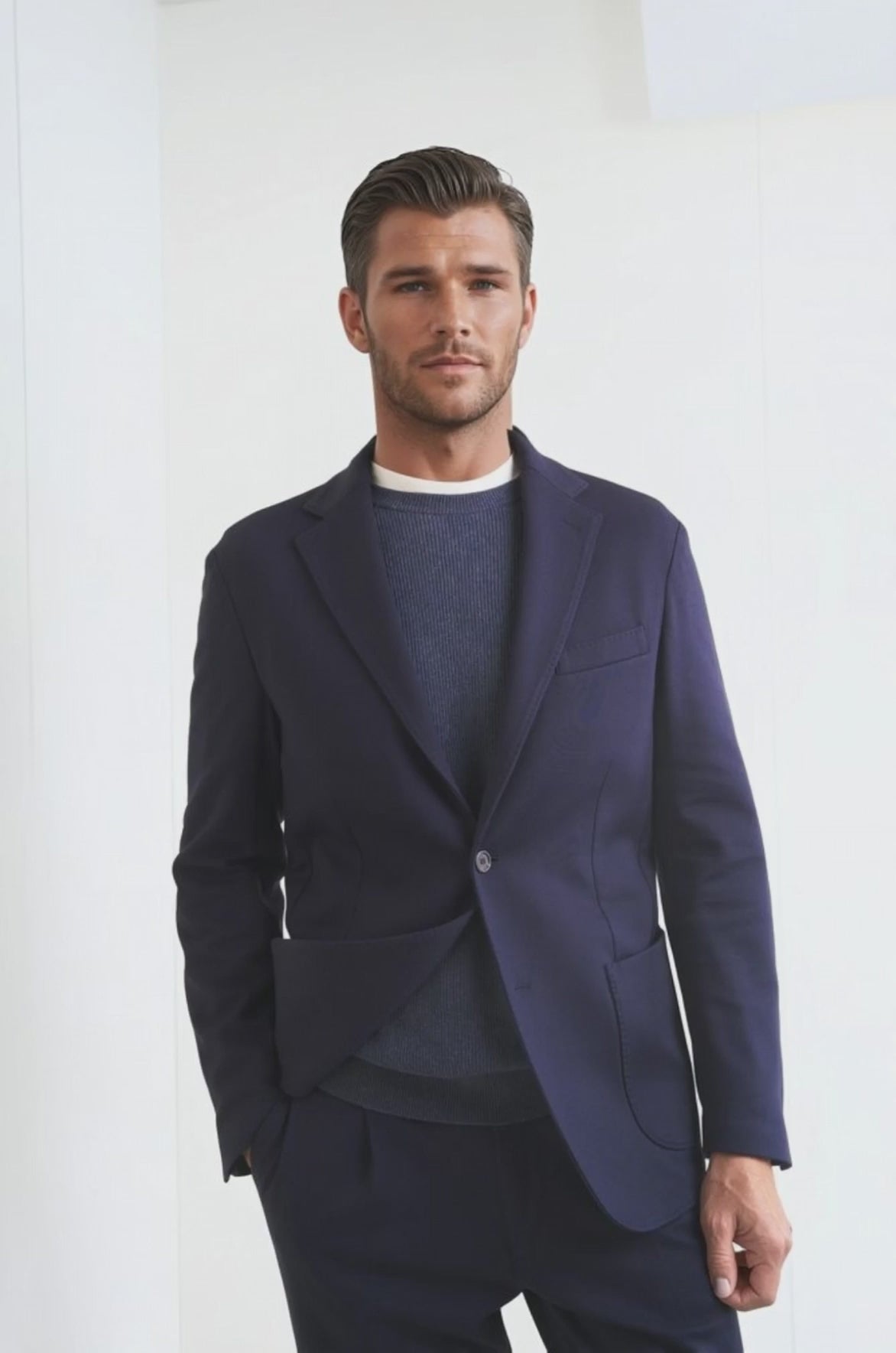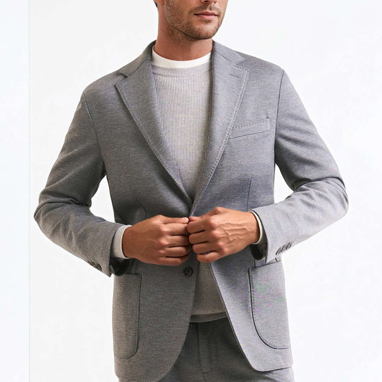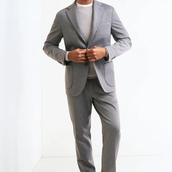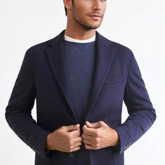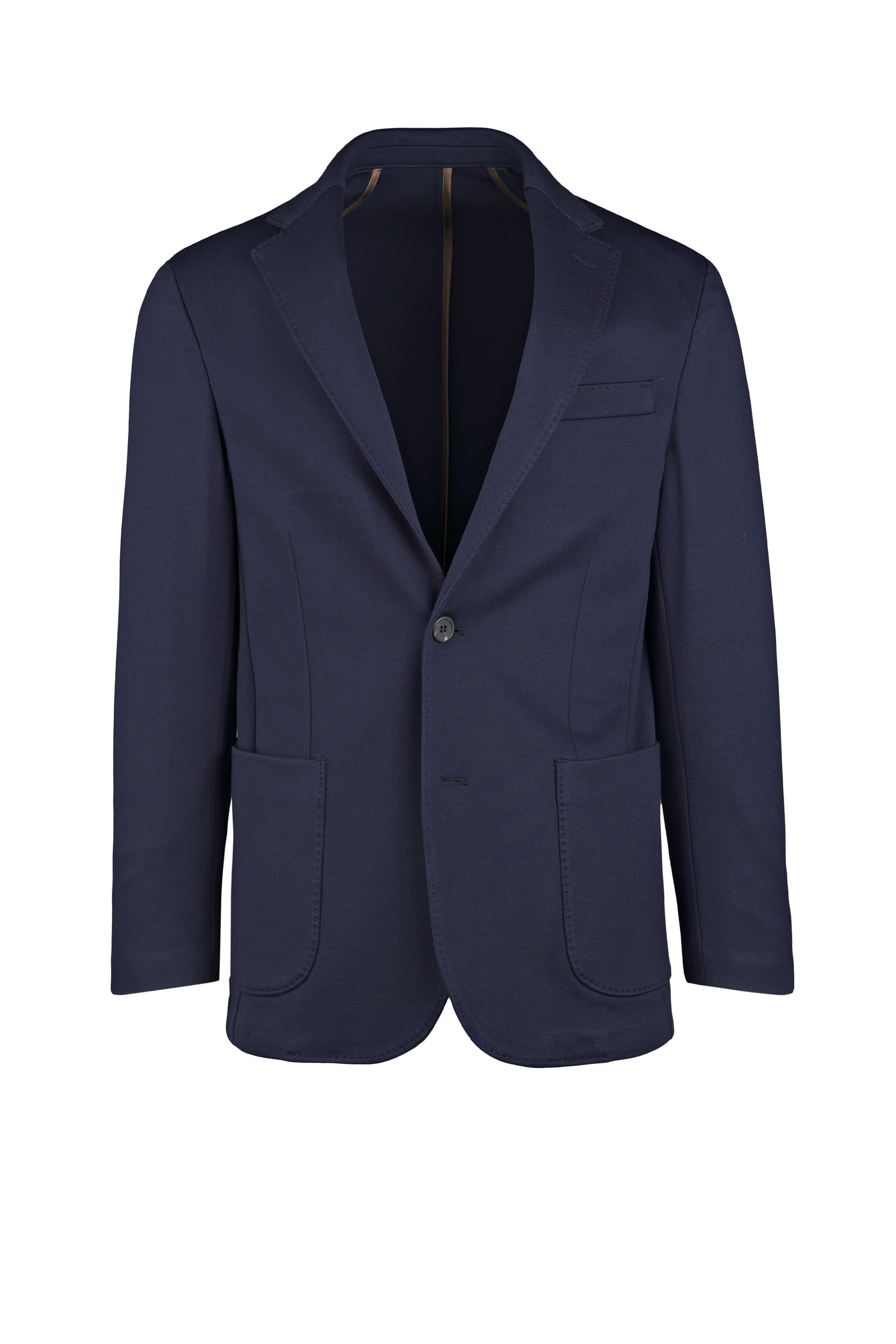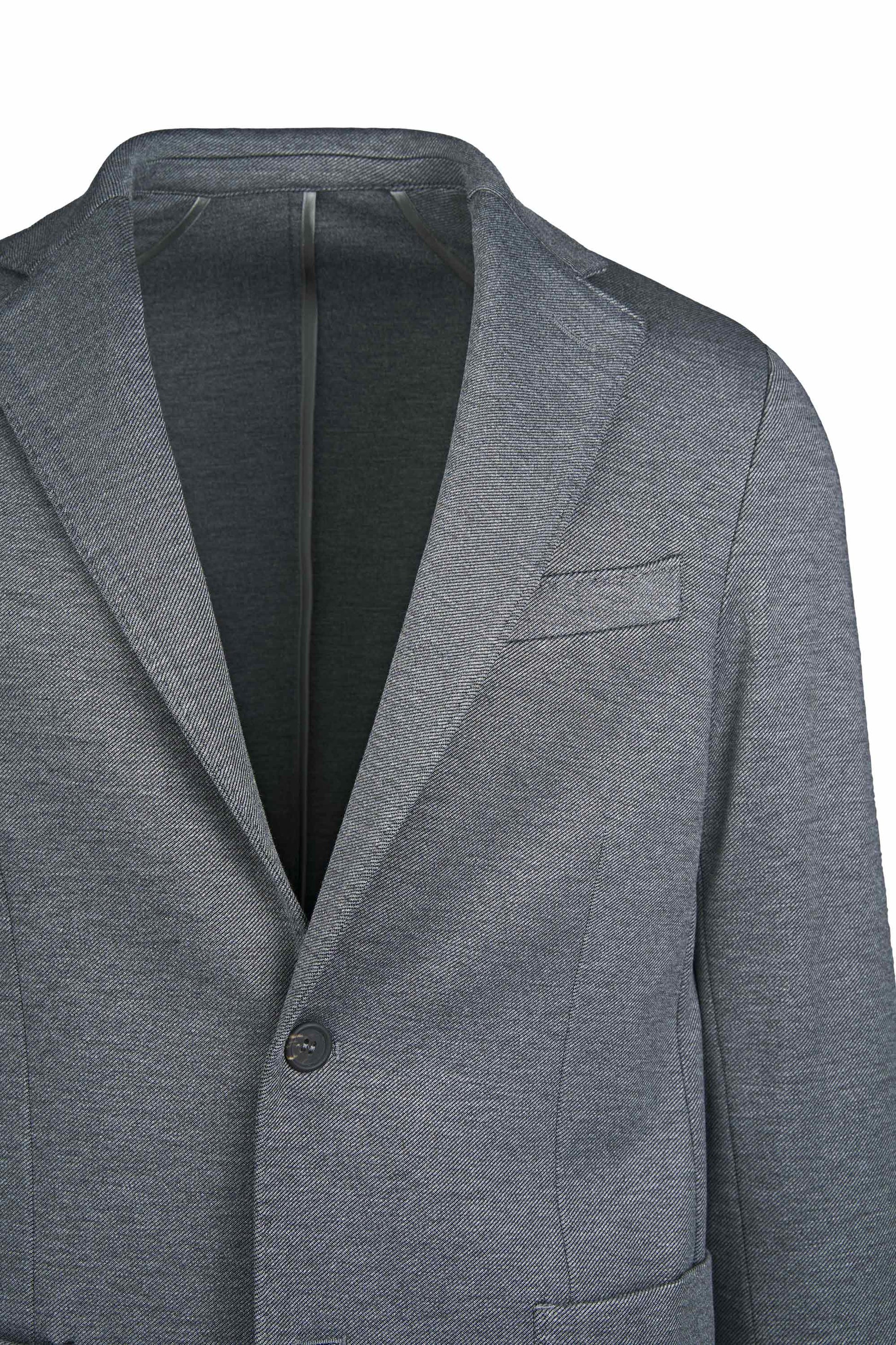 Stretch jersey-twill with a compact yet soft touch; feather-light unlined construction and natural shoulders for ease of movement; AMF stitching along lapels and edges adds a sartorial note; welt chest pocket and twin patch pockets for everyday utility; cotton-tech blend that is crease-resistant and shape-retentive thanks to elastane; clean, taped interiors for durability.