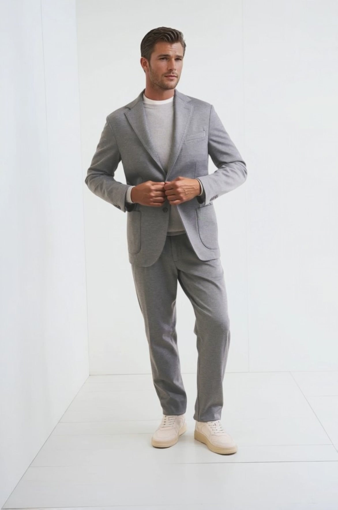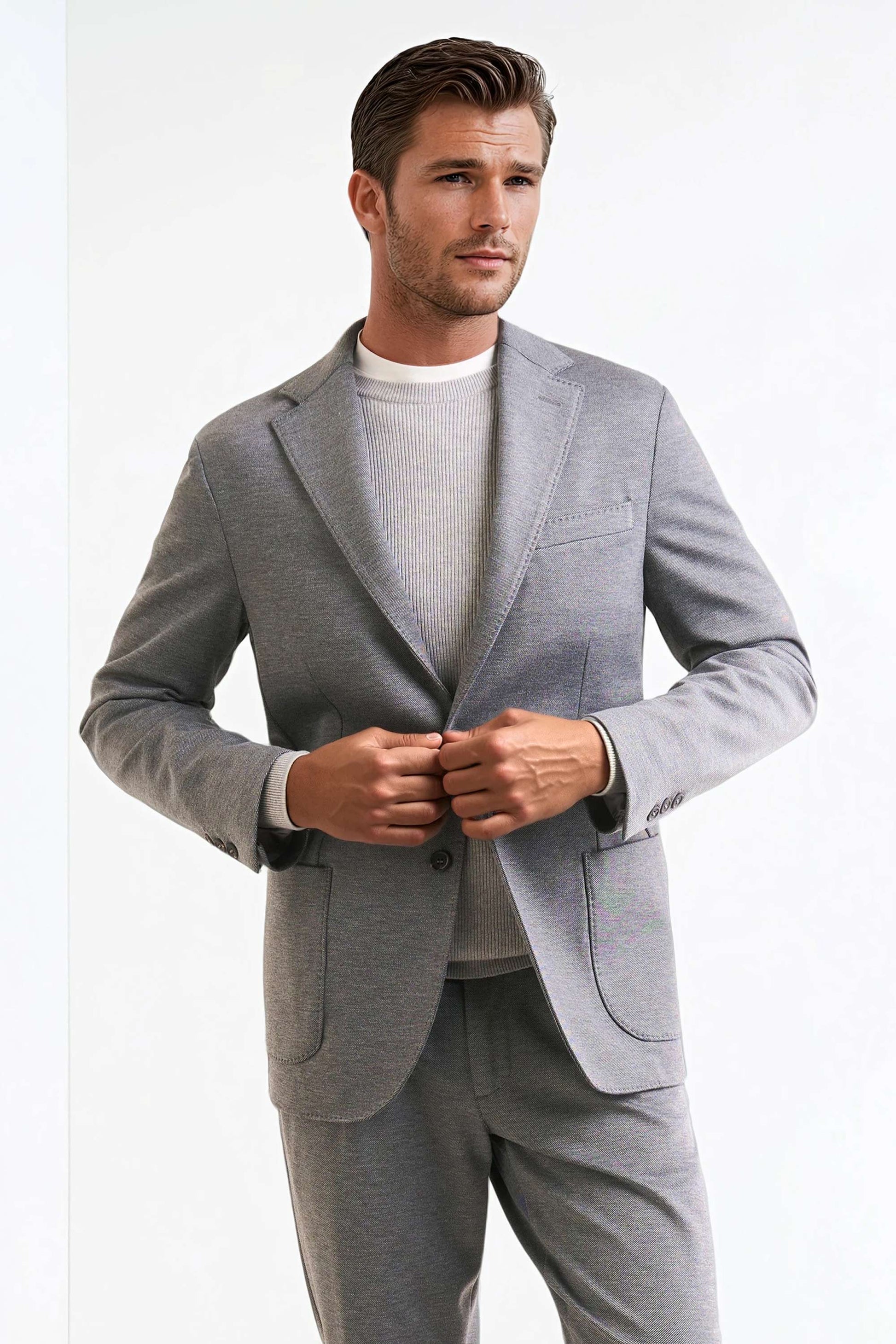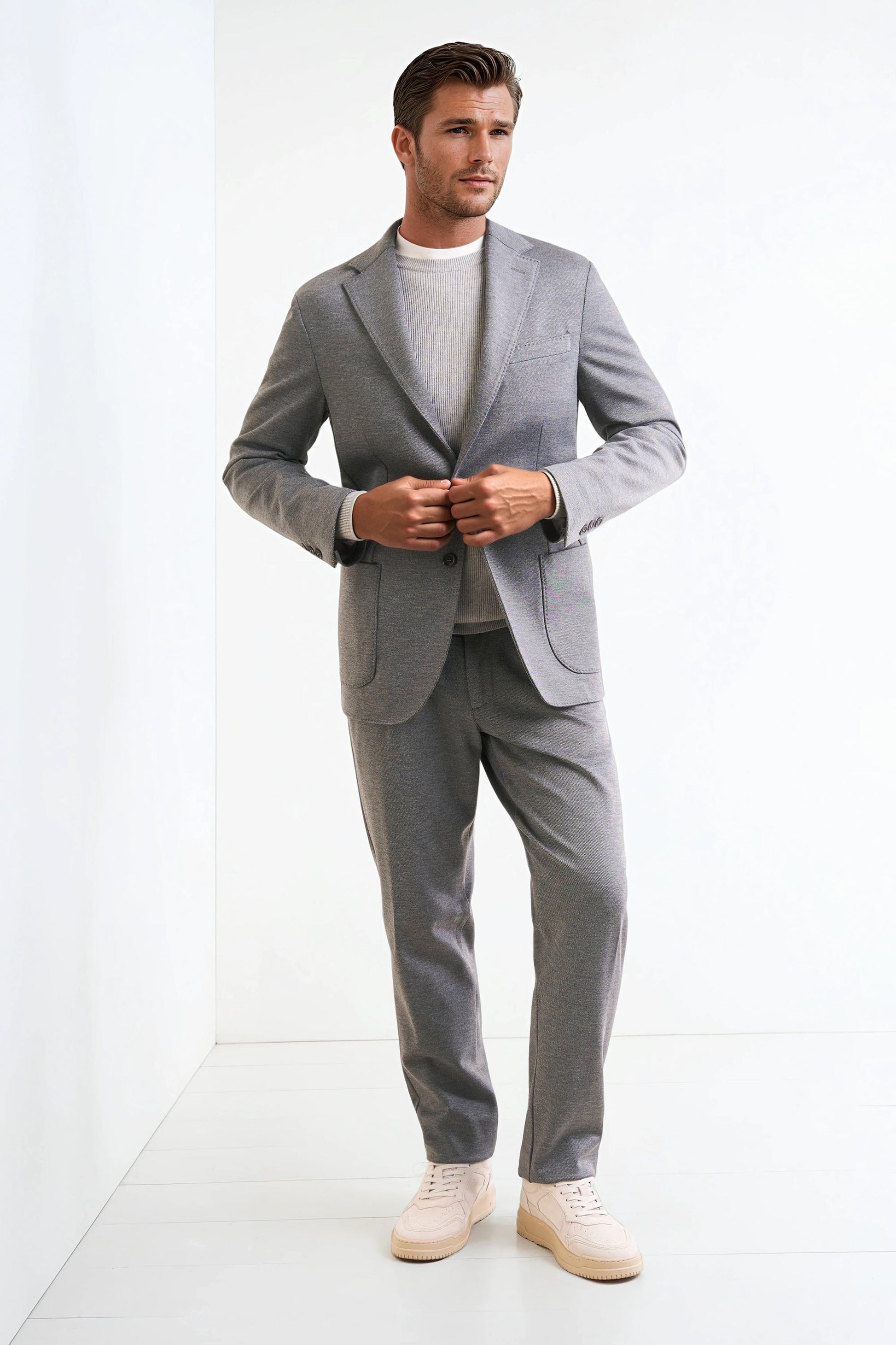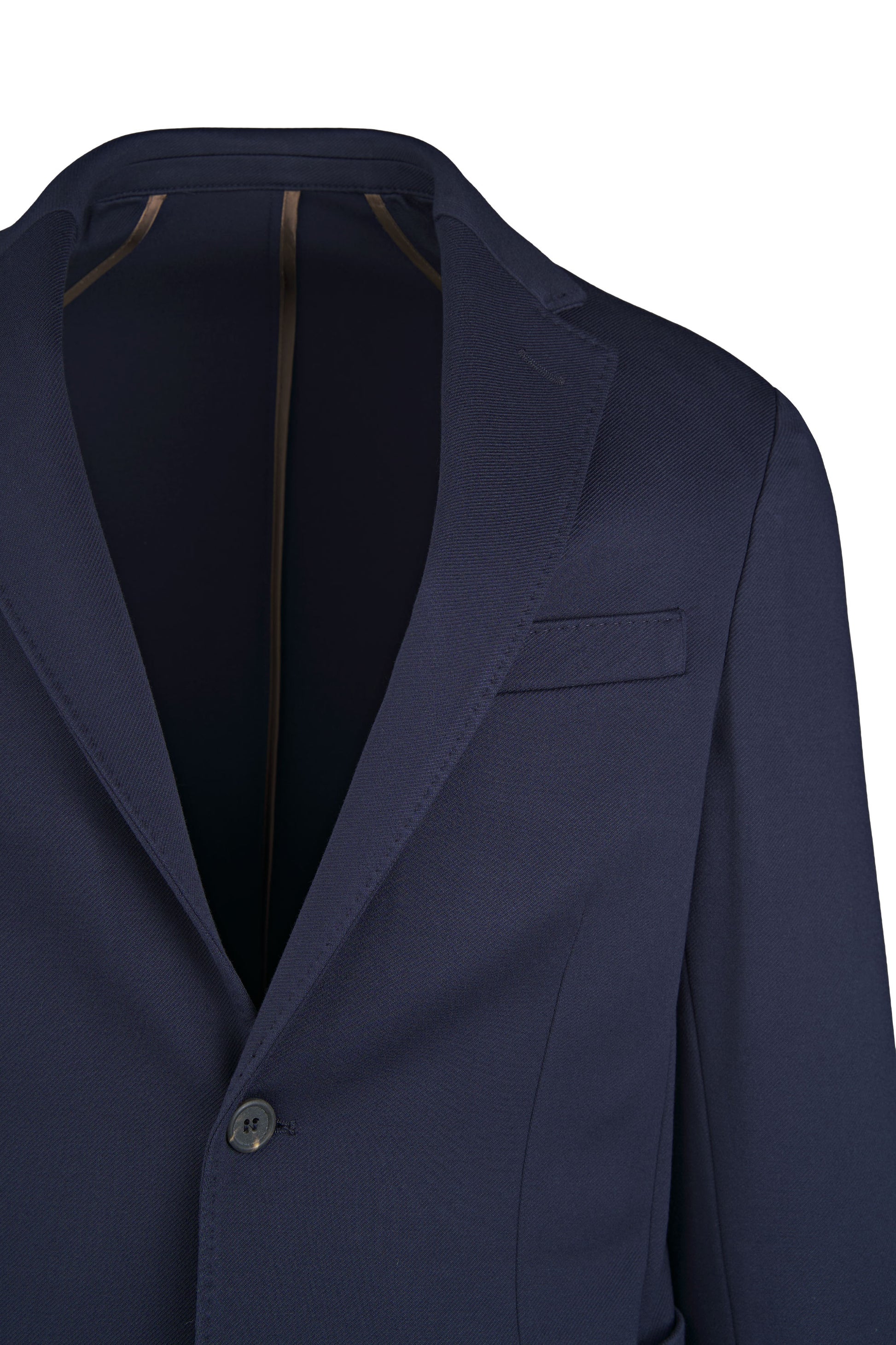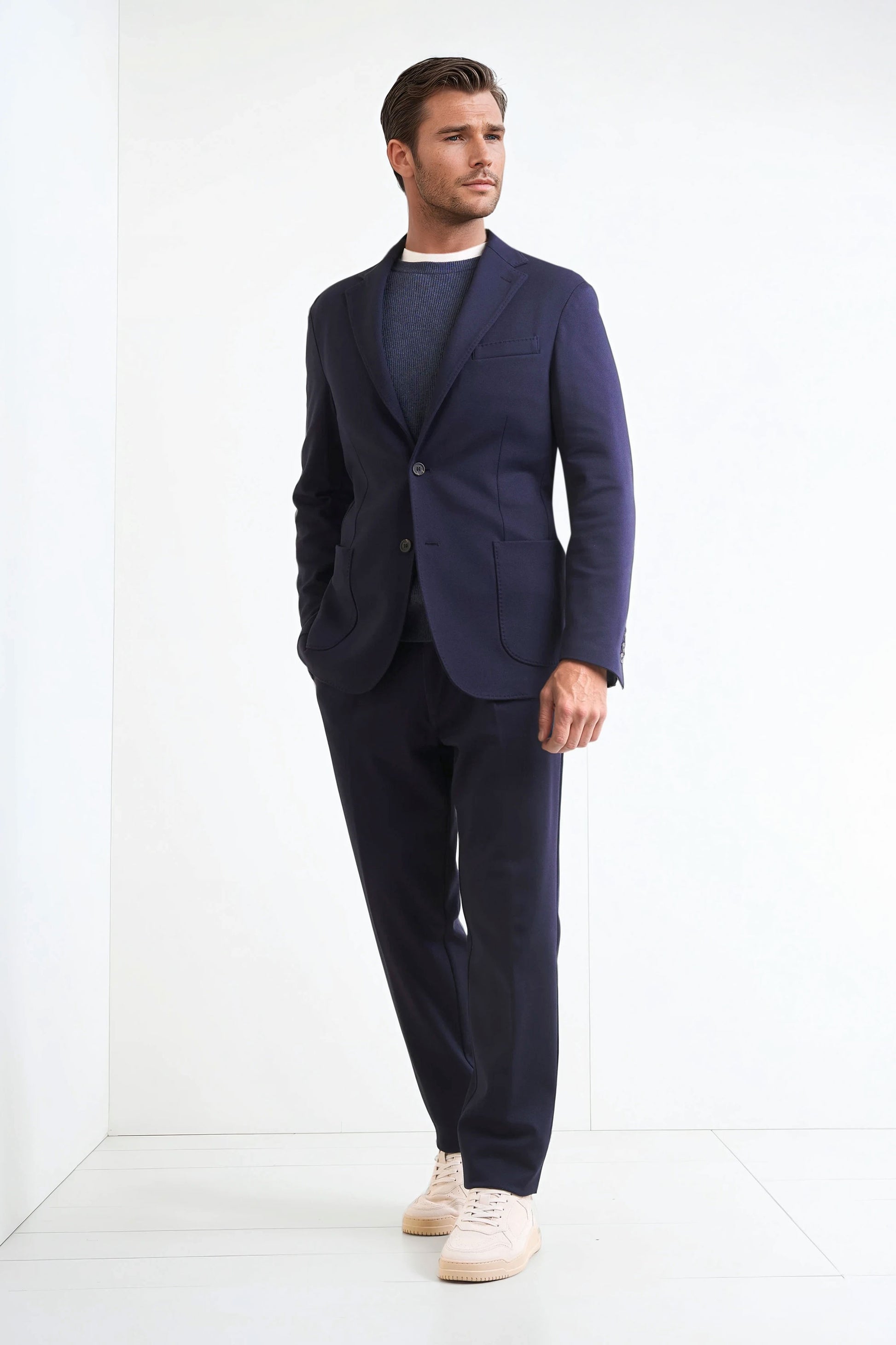 Stretch jersey-twill with a compact yet soft touch; feather-light unlined construction and natural shoulders for ease of movement; AMF stitching along lapels and edges adds a sartorial note; welt chest pocket and twin patch pockets for everyday utility; cotton-tech blend that is crease-resistant and shape-retentive thanks to elastane; clean, taped interiors for durability.