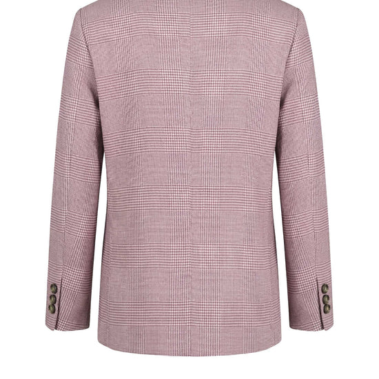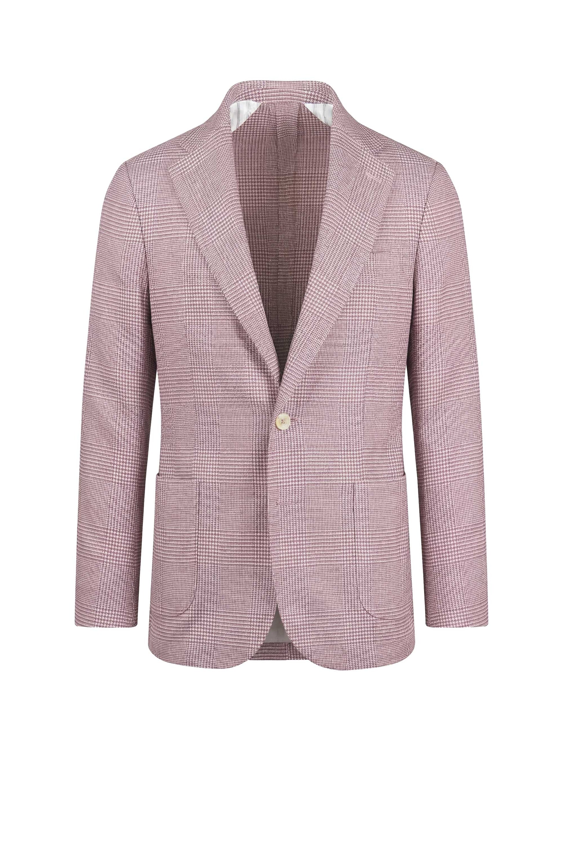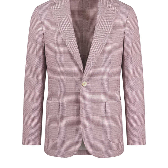 Prince of Wales pattern; textured surface with micro houndstooth and overcheck design; unlined construction; single-breasted two-button jacket; classic lapels; full AMF stitching; chest welt pocket; patch pockets; lightweight breathable structure.