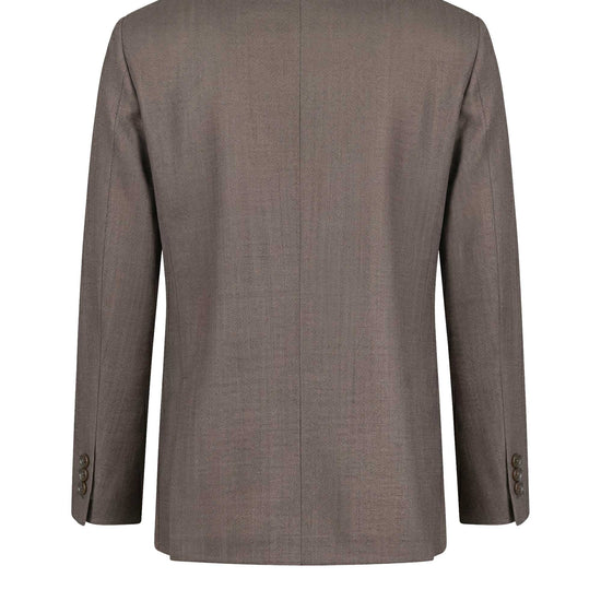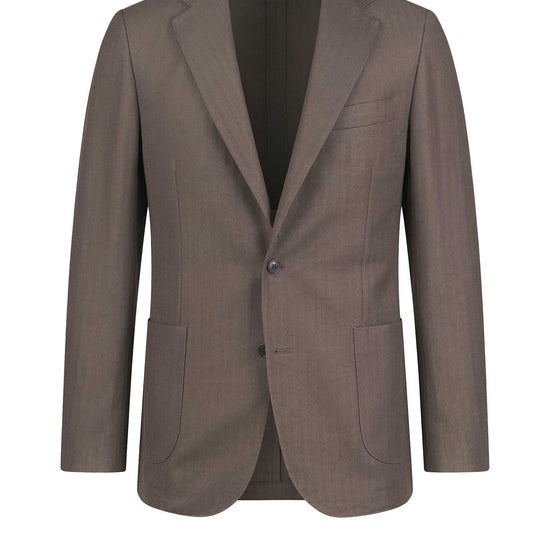 Subtle diagonal micro-textured weave; unlined construction; single-breasted two-button jacket; classic lapels; full AMF stitching; chest welt pocket; patch pockets; lightweight breathable structure.